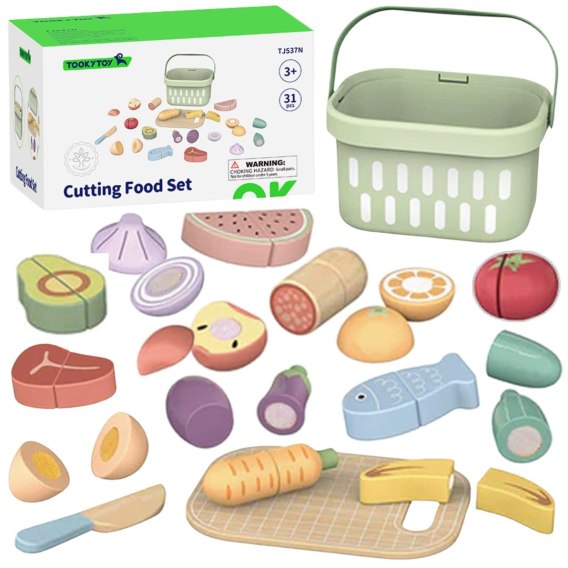 Drewniany Zestaw Żywności do krojenia od Tooky Toy, doskonały do kreatywnej zabawy w kuchni. Zawartość plastikowego pudełka zawiera 31, w tym owoce, warzywa, rybę, jajko, deskę do krojenia oraz nożyk. To kompleksowe wyposażenie pozwala na przygotowanie smacznych posiłków. Drewniany zestaw żywności do krojenia nie tylko rozwija wyobraźnię dziecka, ale także wspiera rozwój umiejętności manualnych. Używając tego zestawu, maluchy mogą wcielać się w rolę małych kucharzy, co rozwija ich kreatywność i umiejętności społeczne poprzez zabawę w udawanie różnych sytuacji kuchennych. Zabawa w krojenie i przygotowywanie posiłków pomoże dzieciom w nauce o zdrowym odżywianiu i zrozumieniu różnorodności żywności.