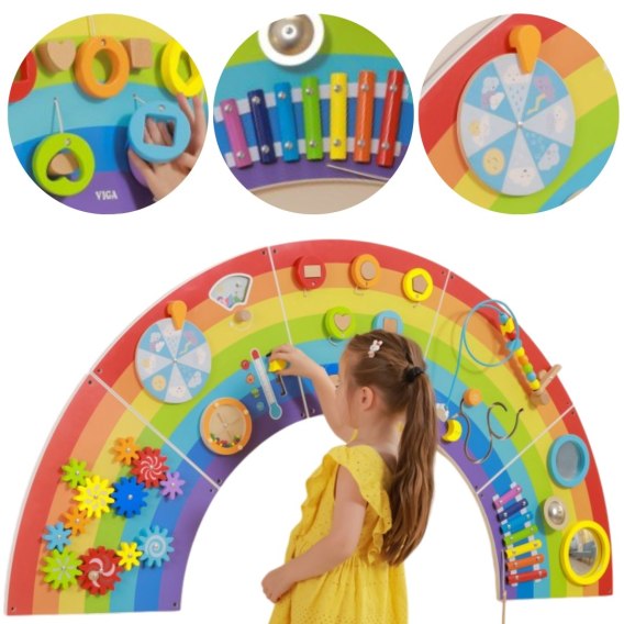 Tablica Sensoryczno - Manipulacyjna Tęcza marki Viga Toys to drewniana, wielofunkcyjna zabawka na ścianę, która zapewni dzieciom godziny świetnej zabawy. Wśród różnych aktywności znajdziesz tutaj 12 czynności: obracające się koła zębate, tablicę pogody, toczący się dysk, dopasowanie klocków, ksylofon, wklęsłe i wypukłe lustro, gong i przeplatanka koralików. Tablica pogody została specjalnie zaprojektowana, aby pasowała do motywu tęczy.Zmieniający się panel pór roku można badać w połączeniu ze zmianami pogody i wahaniami temperatury.Podzielony na 5 części dla łatwego transportu i montażu.Wszystkie 5 części są tej samej wielkości, dzięki czemu można je montować w dowolnej kolejności.Zakrzywiona konstrukcja zachęca dzieci o różnym wzroście do jednoczesnej zabawy i nauki podstawowych pojęć dotyczących kolorów, kształtów, dźwięków i pogody. Zabawka została zaprojektowana tak, aby stymulować zmysły i wspierać rozwój motoryki dziecka. To doskonałe ćwiczenie zręczności małych paluszków. Zabawka uczy również logicznego myślenia oraz cierpliwości. Idealne uzupełnienie środowiska wczesnej nauki i placówek opieki nad dziećmi.